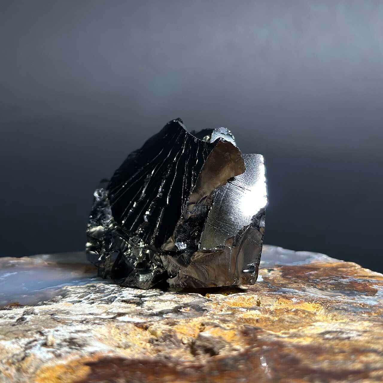 エリートシュンガイト(=ノーブルシュンガイト)は、通常のシュンガイトよりも炭素の含有率が高く、黒い表面が金属のように光沢を帯びているのが特徴です。