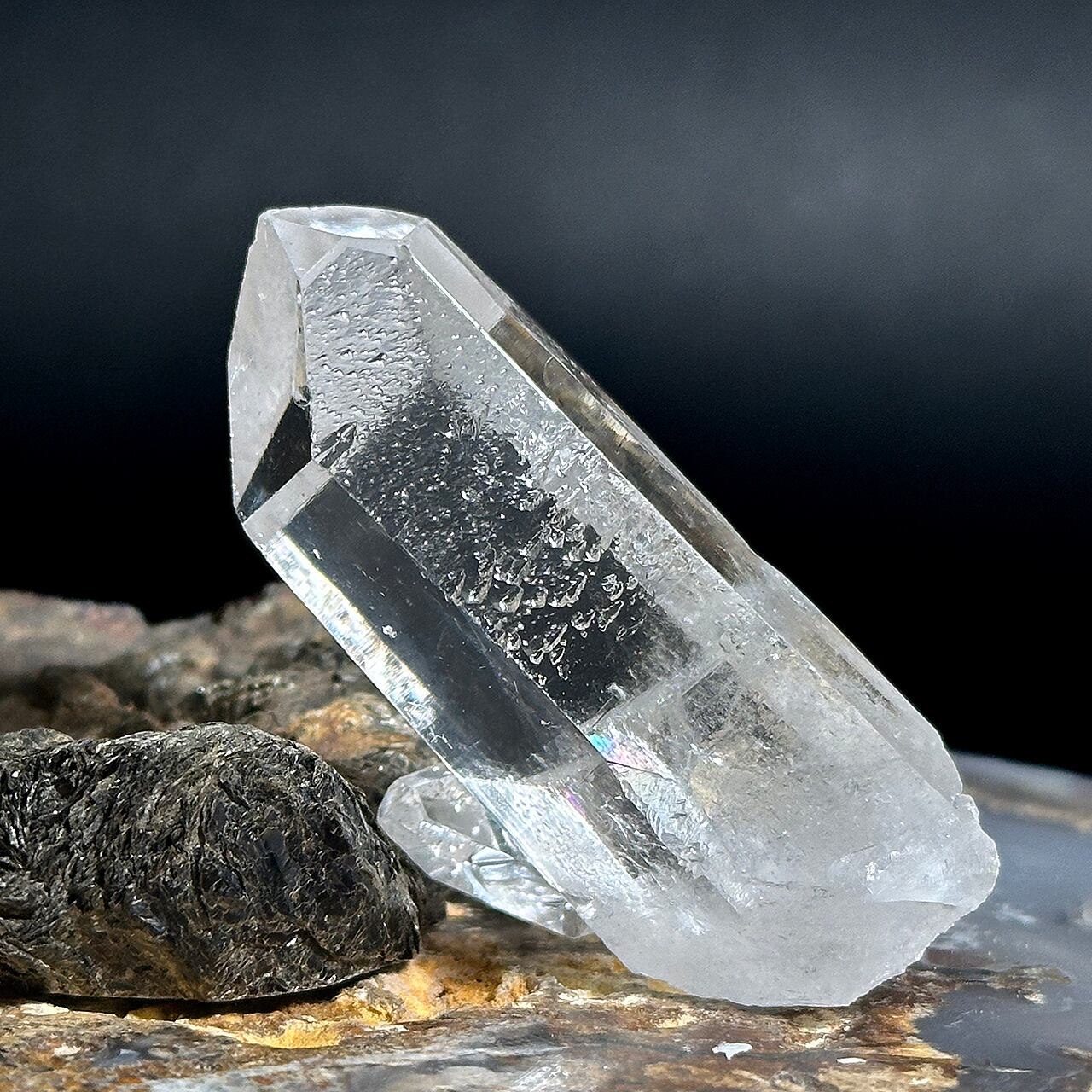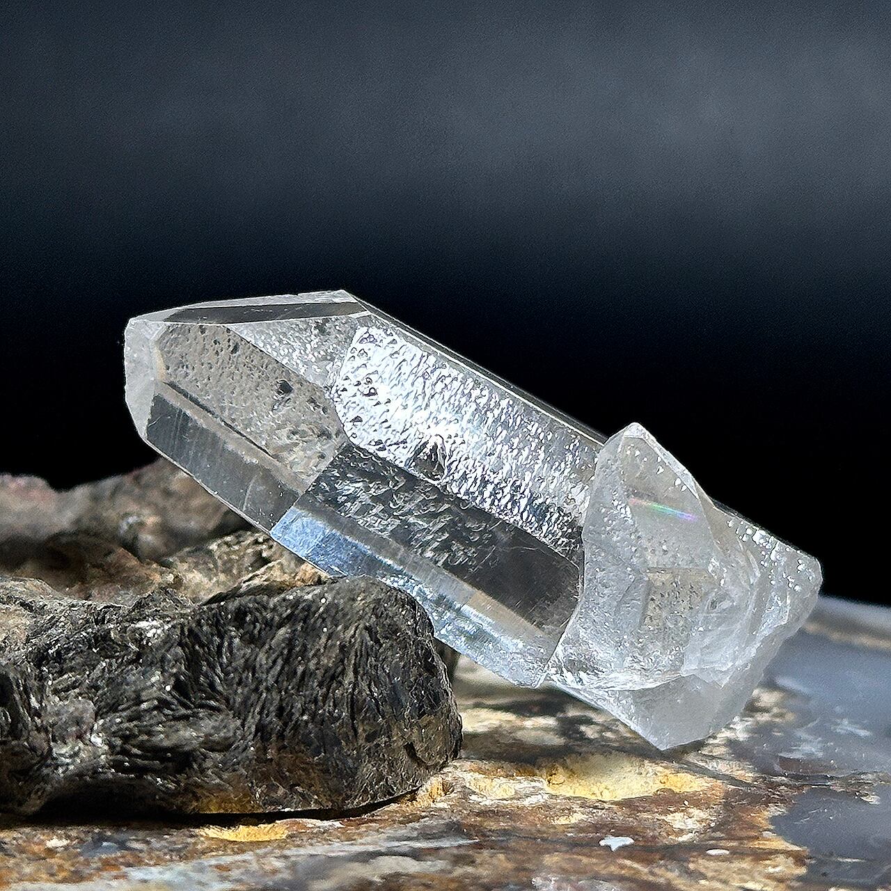 さらに、柱面にくっついている小さな結晶と接している部分には美しい虹も出ます。