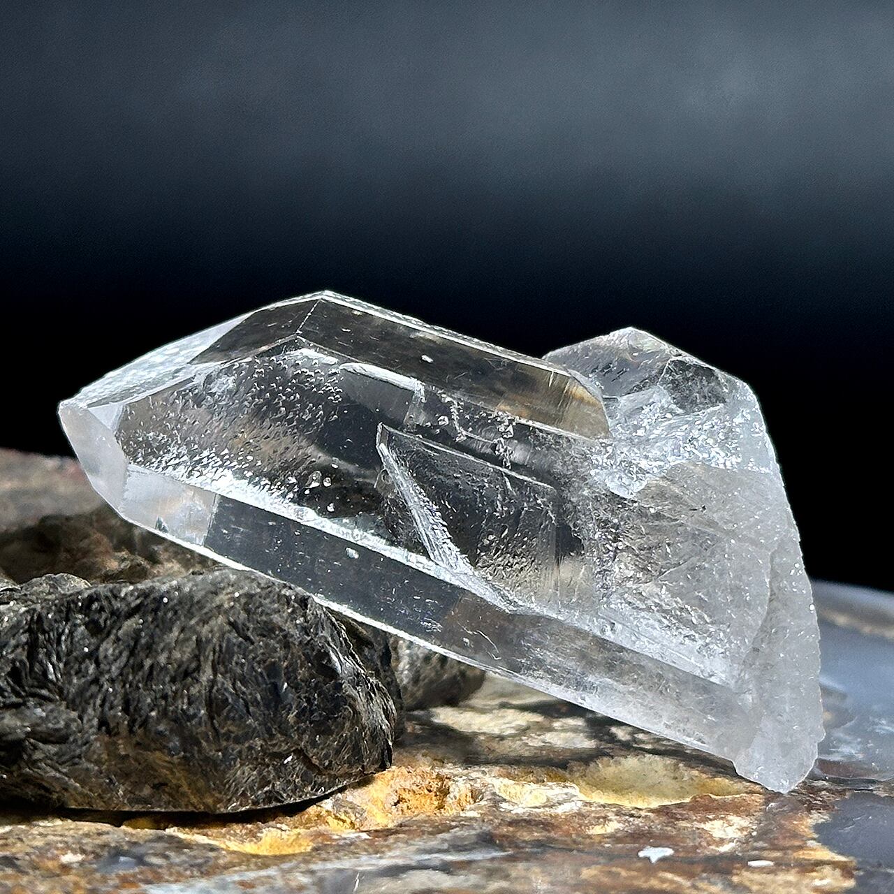 圧倒的な透明度の高さと、柱面のスターブラリー(この産地の水晶特有の模様)が非常に個性的です。