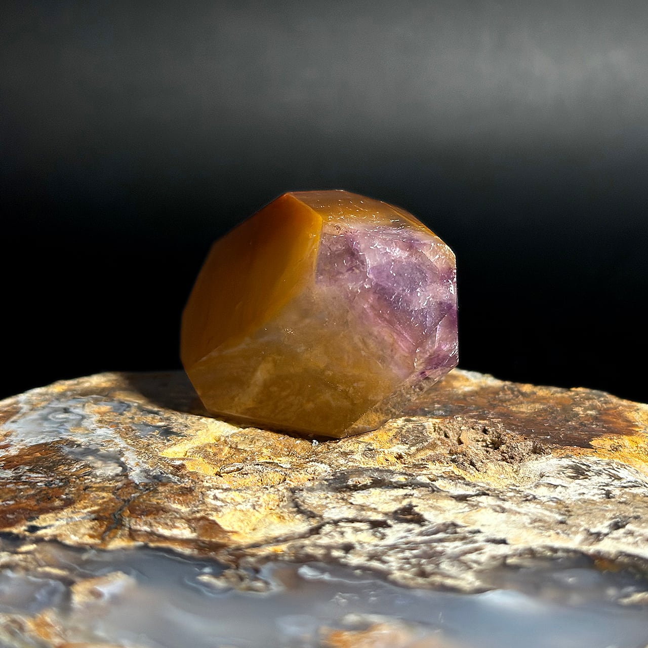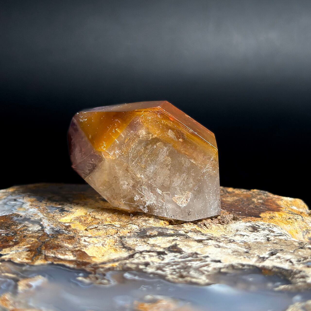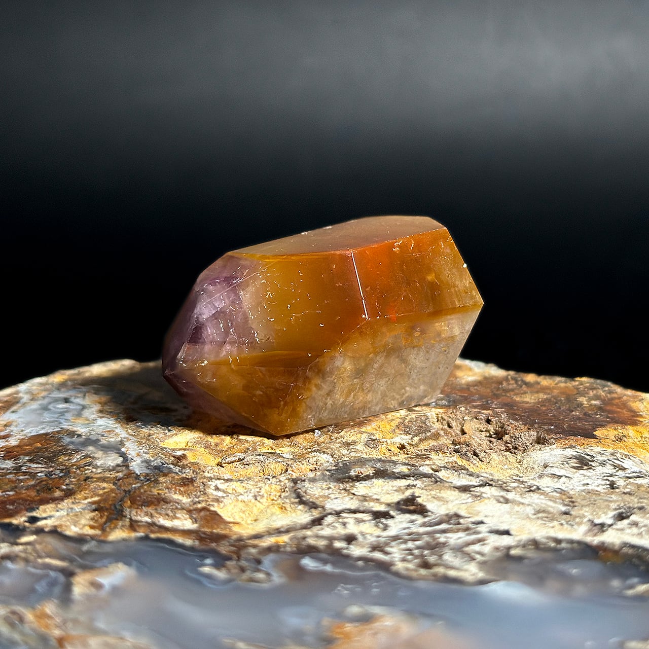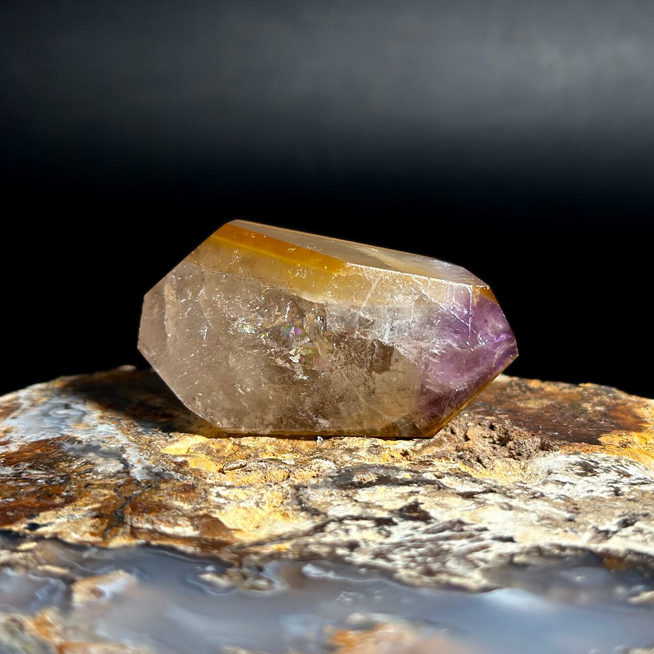 クリアクオーツの周りに、濃い紫色のアメジストの層、鉄分を含んだ赤紫の層・黄色・オレンジっぽい色の層などが覆い被さるように色付いている、ちょっと不思議な珍しいクリスタルです。