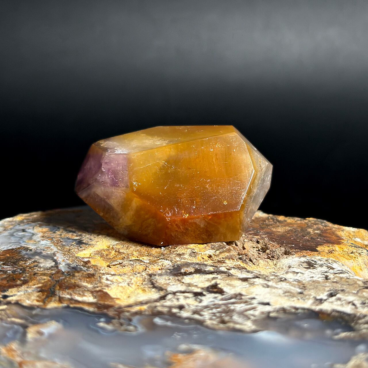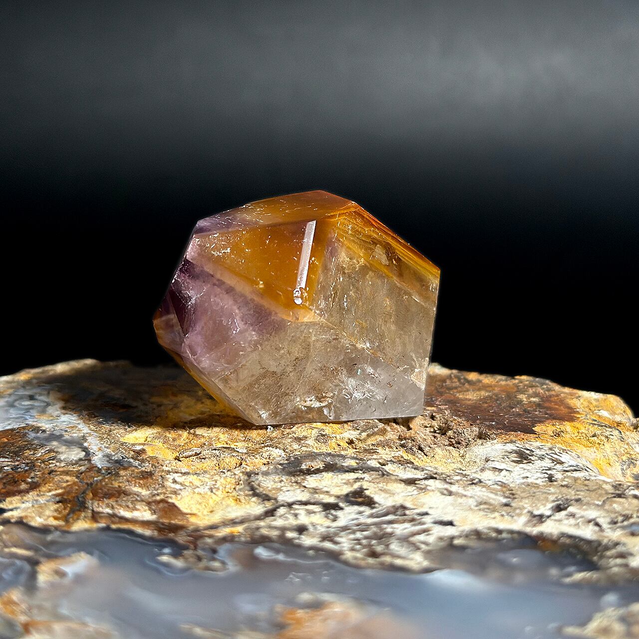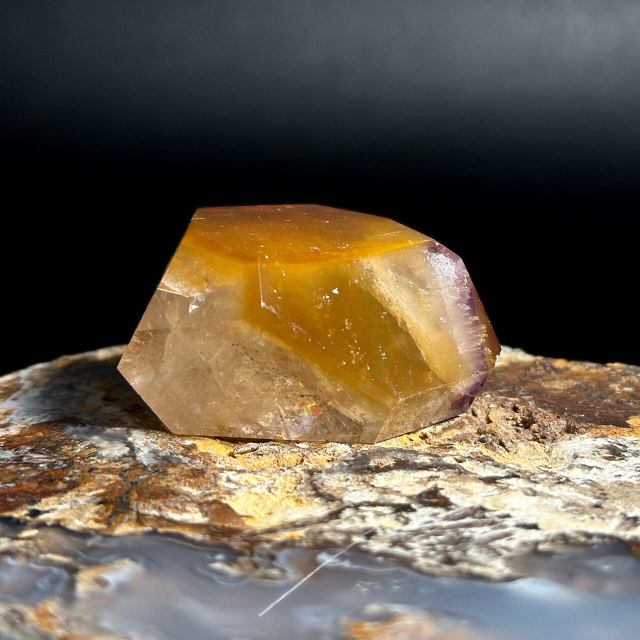 クリアクオーツの周りに、濃い紫色のアメジストの層、鉄分を含んだ赤紫の層・黄色・オレンジっぽい色の層などが覆い被さるように色付いている、ちょっと不思議な珍しいクリスタルです。