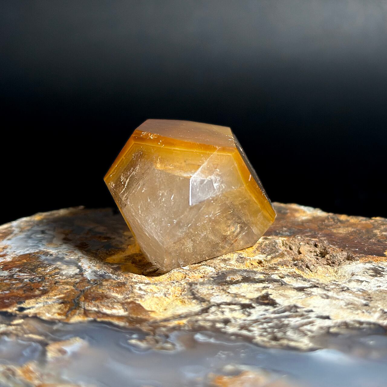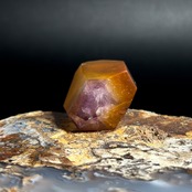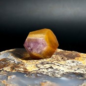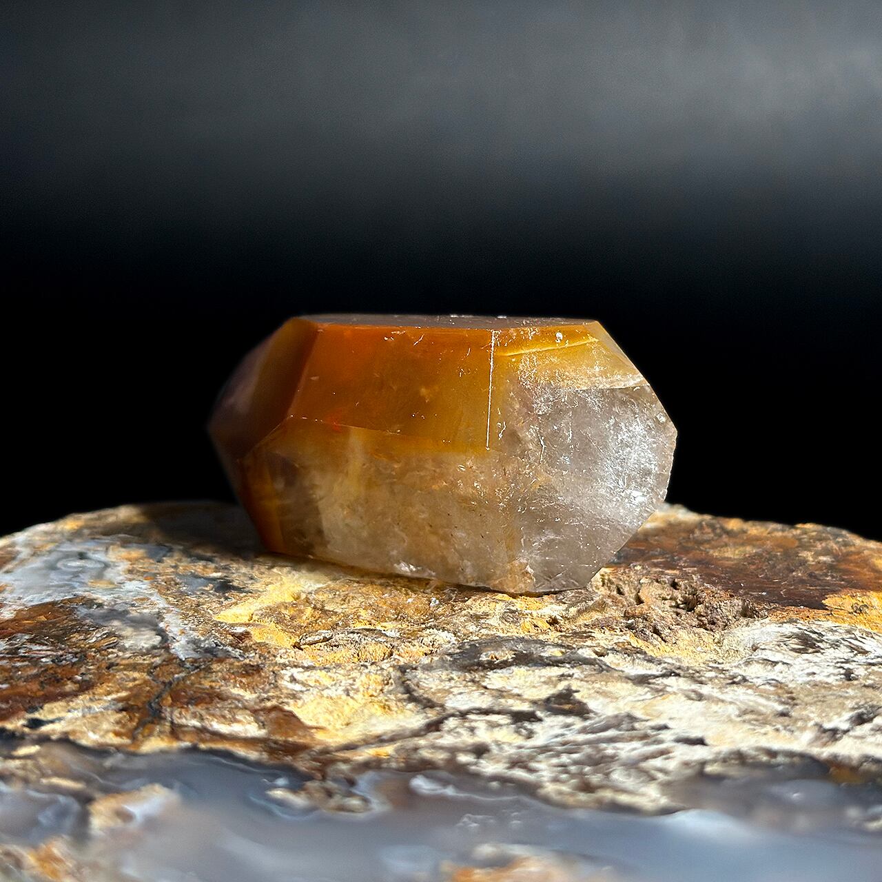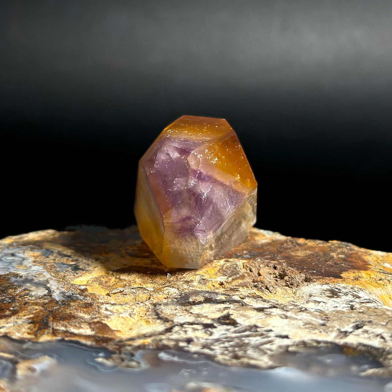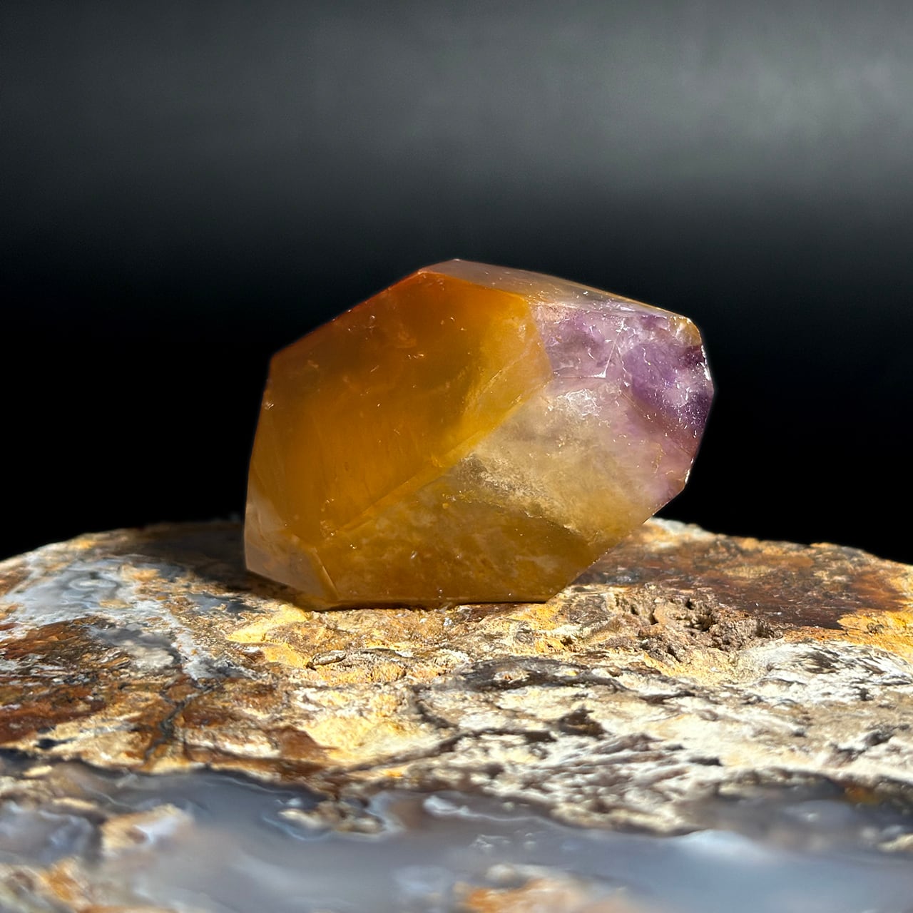 クリアクオーツの周りに、濃い紫色のアメジストの層、鉄分を含んだ赤紫の層・黄色・オレンジっぽい色の層などが覆い被さるように色付いている、ちょっと不思議な珍しいクリスタルです。