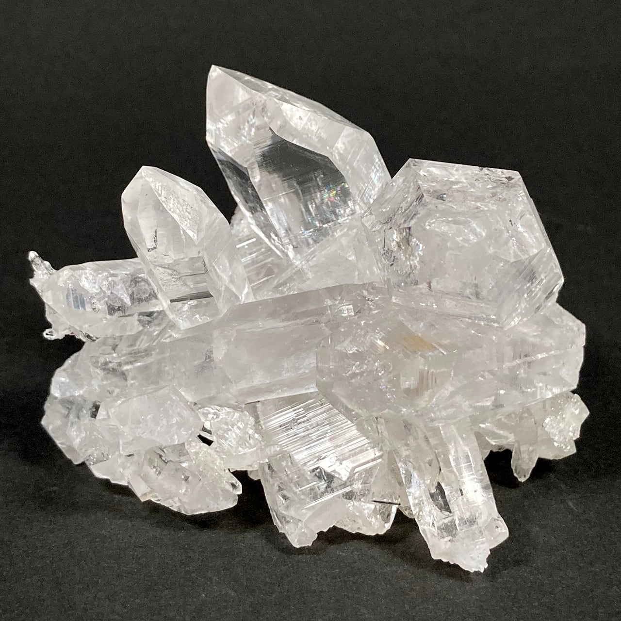 それぞれのポイントの側面にはしっかりと条線が残り、この透明度の高さから、繊細なクラックに浮かぶ虹も綺麗に見ることができます。また、一部には黒い針状の鉱物がインクルージョンされているのも見受けられます。
